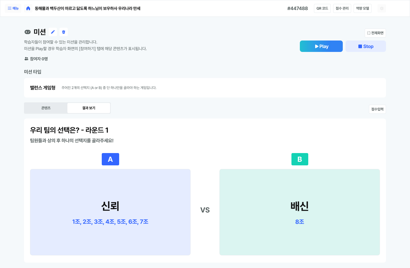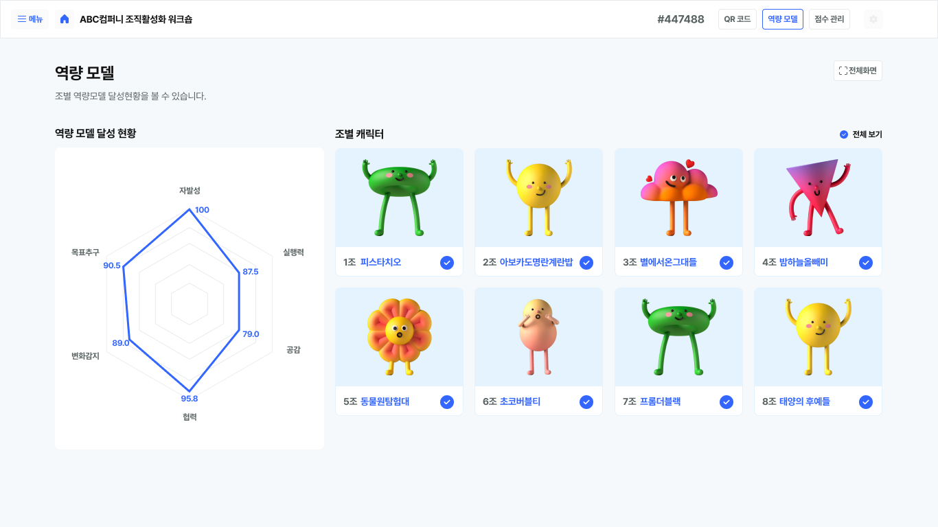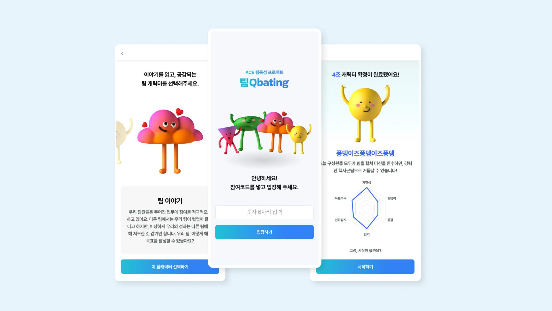 #조직활성화 #팀빌딩 #소통과 협업 #문제해결 최강 팀캐릭터 육성을 통한 팀쉽 강화, 팀Q베이팅 팀십 역량을 갖춘 최강 캐릭터 육성을 통해 완벽한 교육 효과 랩업! 102,000원 ~ 1개월 이용권 300,000원 엔터프라이즈 이용권 선택 시 견적문의하기를 통해 문의해주세요! 소개서 다운로드 바로이용하기 바로이용하기 스탠다드 이용권 (7일) 프리미엄 이용권 (1개월) 엔터프라이즈 이용권 (연간) 결제하기 견적문의하기